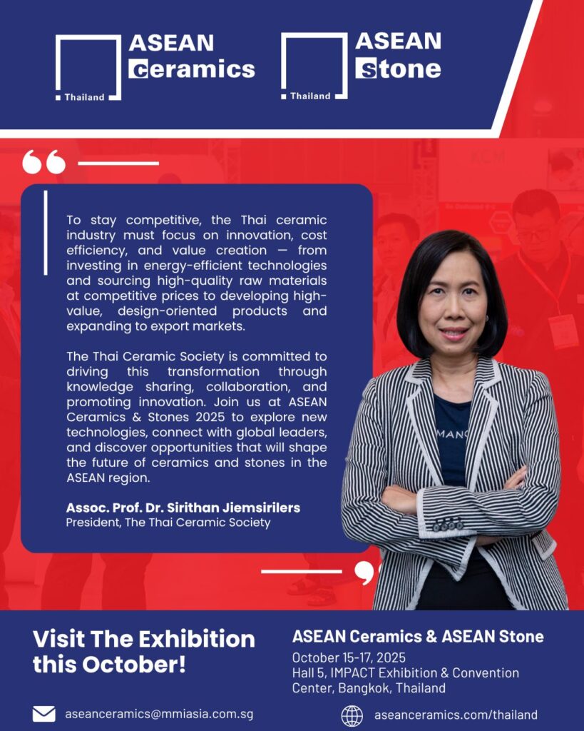 The Thai Ceramic Society proudly supports the ASEAN Ceramics & ASEAN Stone Exhibition — Southeast Asia’s largest and only dedicated trade show for the ceramic and natural stone industries. The exhibitions continue to be the leading platforms for showcasing the latest innovations in machinery, technology, and materials, chemicals and tools of the two industries.
